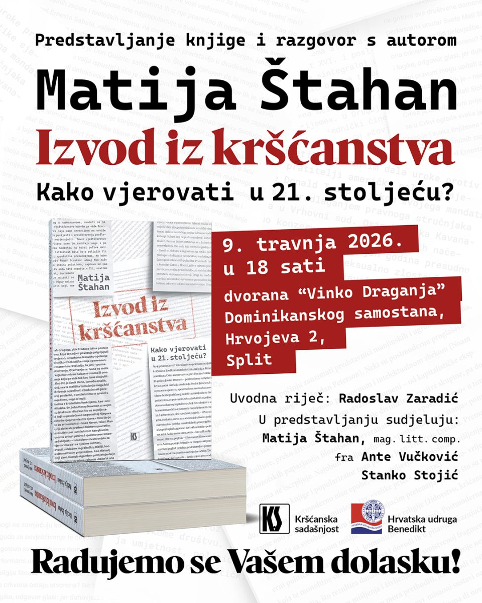 Knjiga Matije Štahana Izvod iz kršćanstva – Kako vjerovati u 21. stoljeću? splitskoj će publici biti predstavljena 9. travnja 2026. godine u 18 sati u dvorani „Vinko Draganja“ Dominikanskoga samostana (Hrvojeva 2, Split). Na predstavljanju knjige u organizaciji Hrvatske udruge Benedikt i Kršćanske sadašnjosti sudjelovat će sam autor Matija Štahan, fra Ante Vučković i Stanko Stojić, dok će uvodnu riječ uputiti predsjednik Hrvatske udruge Benedikt, Radoslav Zaradić.